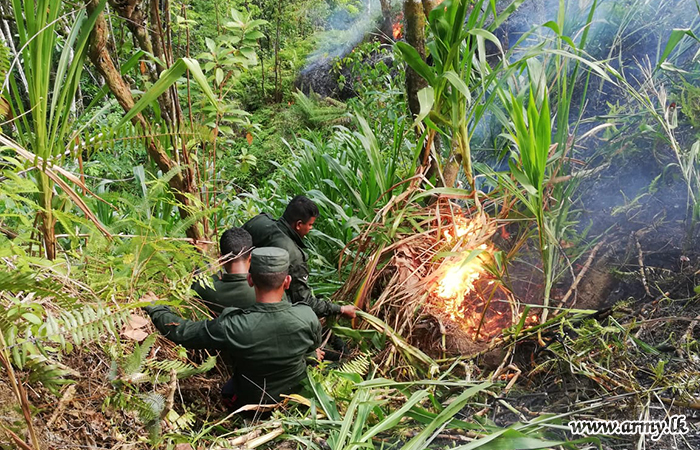 Troops of the 12 Sri Lanka Field Engineers under command to the 612 Brigade of the 61 Division of the Security Force HQ - West brought a sudden bushfire under control at Walallawita-Kapuwatta forest reserve on Thursday (4).