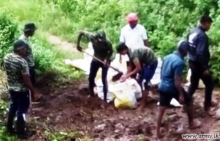 A water leak occurred on the Kombuweththikulam tank bund in Palappanai Grama Niladahari Divison in Mullaittivu District due to heavy rains was repaired using sand bags by 10 Sri Lanka Light Infantry (SLLI) troops with the support of villagers on 13 January 2021.
