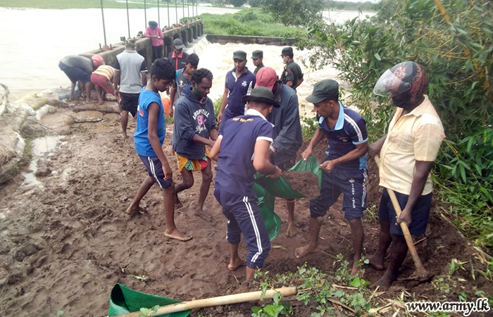 Troops of the 14 (Vol) Sri Lanka Light Infantry of the 621 Brigade on the directions of the 62 Division repaired a cyclonic weather-affected Nikawewa anicut and a part of its tank bund in Welioya on Saturday (05).
