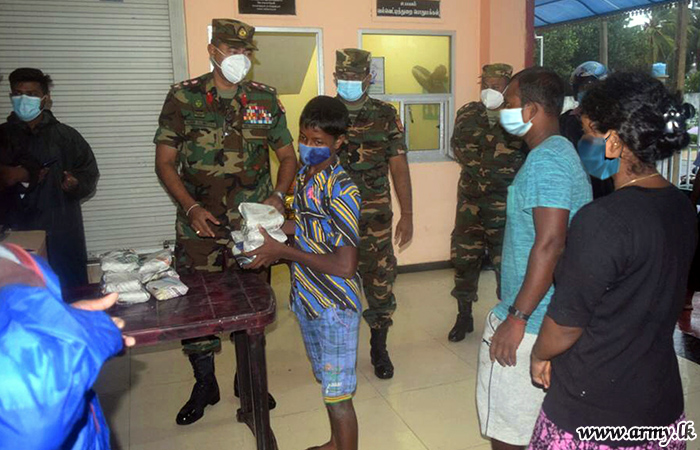 11 Vijayabahu Infantry Regiment troops of the 521 Brigade of the 52 Division under the Security Force HQ-Jaffna distributed cooked meal packets among cyclone and adverse weather affected families in Velvetithurai who were displaced on 03 December 2020.