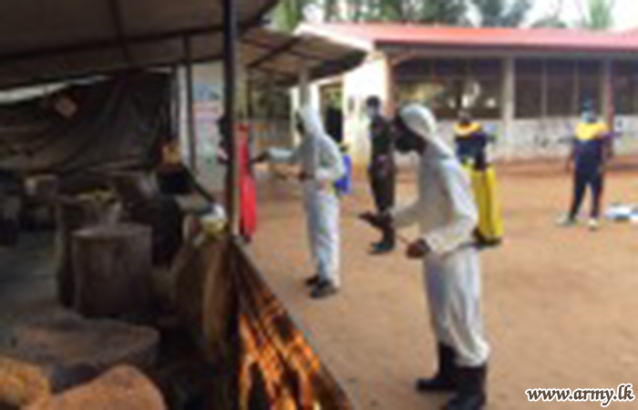 Mullattivu-based 68 Division troops of the Security Force Headquarters - Mullaittivu (SFHQ-MLT) on the directions of Major General Jagath Rathnayake, Commander, Security Forces - MLT and Major General Upali Rajapaksha, General Officer Commanding, 68 Division on Friday (30) carried out a disinfection and sterilization campaign in and around the public market place and fish market in order to mitigate risks of contamination during the spread of COVID - 19 threat.