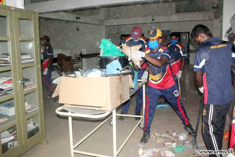 Adding their contribution to one more community project at the request of hospital authorities, the troops of 4 Battalion of the Gemunu Watch under command to 231 Brigade of the 23 Division HQ joined hands with hospital staff on Sunday (18) to clean the Karadiyanaru Base Hospital in Batticaloa, now a COVID - 19 treatment center.