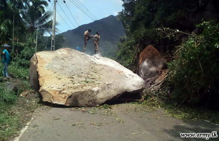 A platoon of 581 Brigade troops in Kotagala assisted the Disaster Management Centre and Road Development Authority staff to remove a huge rock boulder that has fallen on Hatton-Nuwara Eliya road at Ranpadeniya a few days ago.