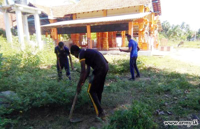 Troops of the 24 Sri Lanka Sinha Regiment (SLSR) under command to the 591 Brigade of the 59 Division under the Security Force HQ- Mullaittivu during a Sharamadana campaign cleaned the Kumalamune Kattu Hindu temple on Friday (18).