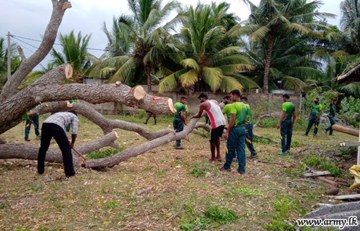 17 (V) Sri Lanka Sinha Regiment (SLSR) troops in Omanthai on the directions of the Commander, 562 Brigade, Colonel Senaka Premawansa recently cleared a huge tree fallen to the Ganeshapuram Temple premises following a heavy storm that swept across the area.
