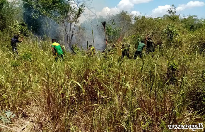 A platoon of troops of the 53 Division (RSF) in response to a request made by the Wildlife Conservation Department recently doused a bushfire that broke out around the western entrance to the Minneriya National Sanctuary in the general area of Mahasengama.