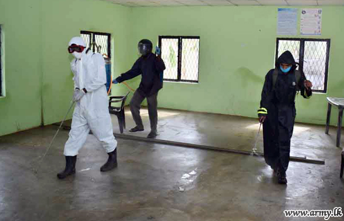 Members of the Security Force Headquarters - Mullaittivu (SFHQ-MLT) with the support of troops in the Divisions, Brigades, Units and other formations are currently engaged in sterilizing and disinfecting all Polling Booths and Counting Centres upon culmination of the General Election - 2020.