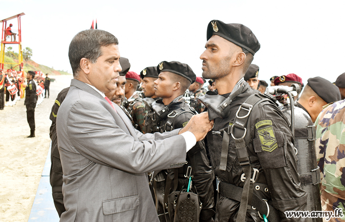 The Passing Out Parade (POP) of 7th batch of the Special Forces’ (SF) Combat Divers took place on Saturday (25) at the SF Combat Diving Training School at Nayaru, Mullaittivu. Additional Secretary (Defence) at Ministry of Defence Mr P.B.S.C Nonis attended the occasion as the Chief Guest.
