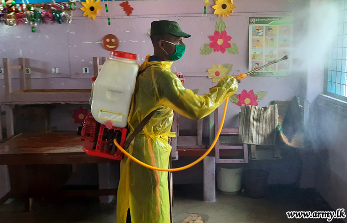 On the directives of Major General Ruwan Wanigasooriya, Commander Security Forces - Jaffna, 51 Division troops, ahead of the planned re-opening of schools in the peninsula after COVID - 19 threat, carried out disinfection and sterilization of schools in order to...