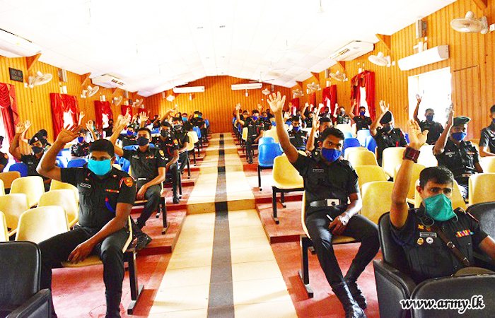 An awareness lecture on ‘Prevention from COVID-19 Pandemic’ got underway for the benefit of the troops of the Security Force Headquarters - Kilinochchi on Wednesday (13). Participants paying special concern on health guidelines and maintenance of the social distancing sat there to listen to it.