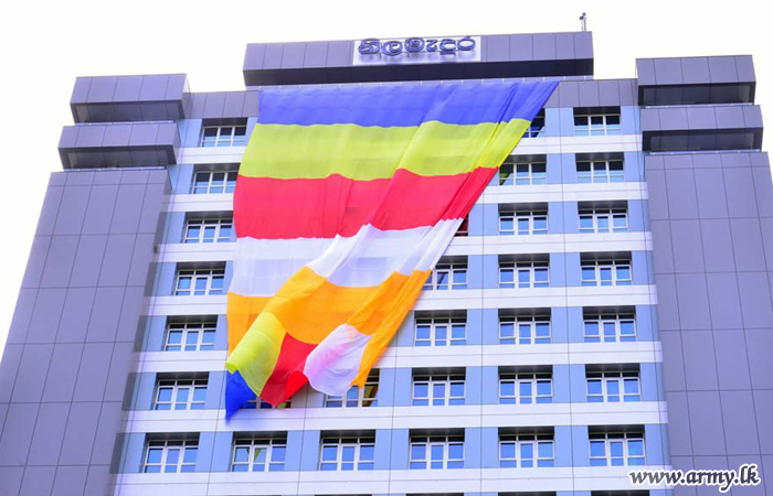 Sri Lanka Corps of Military Police (SLCMP) troops on account of Vesak, Thrice Blessed Day of Buddhists produced a huge 100 x 67 ft Buddhist Flag and hung it atop of the Colombo District Secretariat Building at Colombo 5 on Vesak Day (7).