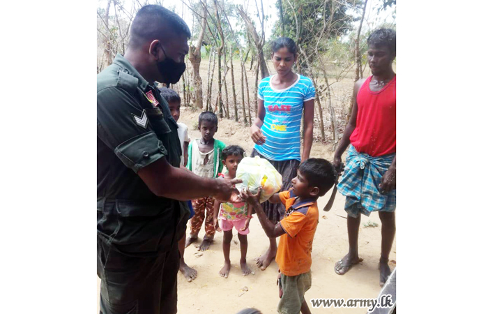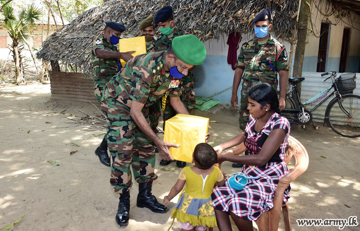 Troops of the 65 Division under command to the Security Force Headquarters -Kilinochchi, together with a group of donors during 6 - 7 April distributed a total of 500 dry ration packs, to the value of Rs 1.5 million...