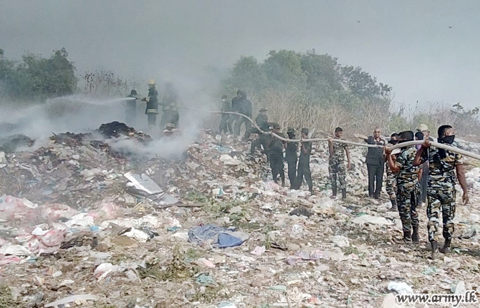 An emergency contingent of Army troops in the 141 Brigade under the 14 Division HQ, supported by firefighters, Navy, Air Force and STF personnel are currently fighting to douse a huge fire that has broken out in the municipal garbage dump at Ambalanmulla...