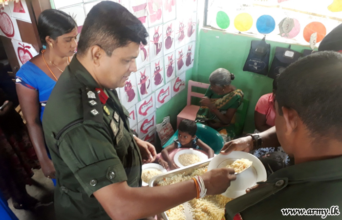 In another community project, intended to further enhance goodwill and reconciliation, 7 Sri Lanka National Guard (SLNG) troops of the 652 Brigade under the 65 Division of the Security Force Headquarters - Kilinochchi provided a sumptuous meal to more than 20 kids in the Haridas Kudirippu Pre-school in Akkarayankulam on Monday (10).