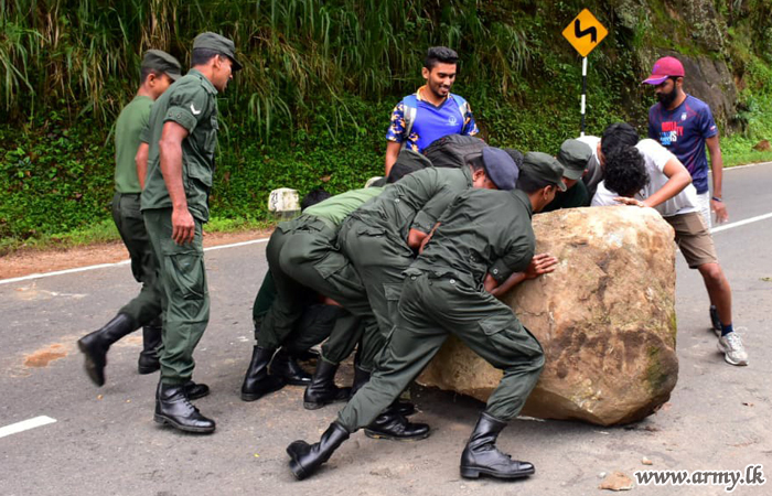 A rock boulder that fell on the road along At Ella wellawaya road near 12 mile post due to torrential rains was cleared by troops serving the Security Force Headquarters- Central on Tuesday (1) since it disrupted the traffic on this road.