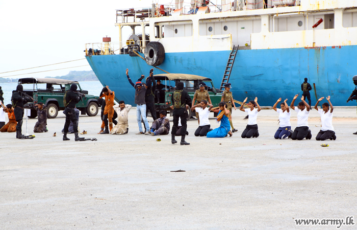 Hours after the inauguration of the Field Training Exercise (FTX) ‘Cormorant Strike - 2019’, troops on Wednesday (4) evening rehearsed a mock operation in the Ashroff Jetty, Trincomalee Harbour area in order...