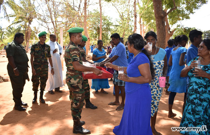 Troops of the Security Forces Headquarters - Kilinochchi warmly welcomed the ‘Paada Yathra’ devotees when they arrived in Kilinochchi area during 4-5 August in order to attend the annual feast at Matha Church in Mulankavil on Sunday (4) before they set out to the Holy Shrine of Madu.