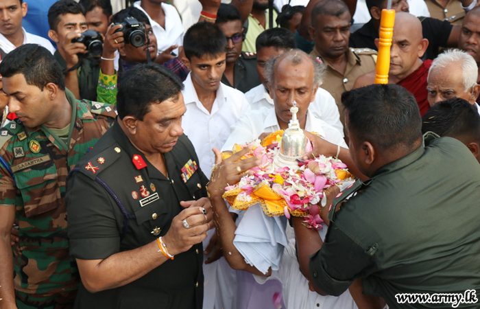 The enshrinement of sacred relics in the newly-erected pagoda (stupa), 'Kalana Mithuru' at Sri Samiddhi Sumana Viharaya in Navatkuli, Jaffna took place on Saturday (13) amid a large gathering of devotees and invitees.