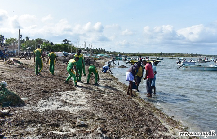 Troops of the 11 (V) Gajaba Regiment giving priority for a community project cleaned the beach patch along Nachchikuda. 11 troops and 15 civilians attended the event.