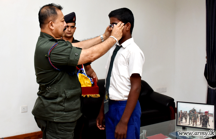 Security Force Headquarters-Kilinochchi (SFHQ-KLN) in cooperation with the ‘Association of Ophthalmic Opticians’, donated a pair of spectacles and a stock of essential school items to a needy student at Paranthan Hindu College after inviting the beneficiary, D. Nikshan on Monday (1) to the SFHQ-KLN.