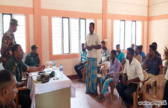 Fishing communities in Koddeikaddiyarkulam, Akkarayankulam, Anavilandankulam and Ambalaperumalkulam areas, served by Kilinochchi Security Forces in the Northern Province on Sunday (16), together with Major General K.A.W Kumarapperuma, General Officer Commanding - 65 Division, met Major General Vijitha Ravipriya, Commander Security Forces - Kilinochchi in order to discuss matters of concern to their industry.