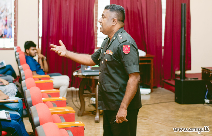 In response to a request made by the University of Sri Jayewardenepura to the Army, Lieutenant Colonel M.B.B.N Herath, General Staff Officer Coordinating 14 Division delivered a lecture on ' Personality Development, Management and Leadership Grooming' on Thursday (28) at the university premises. A group of students in the final year of their studies attended the lecture as initiated by the Career Guidance Unit at the university.