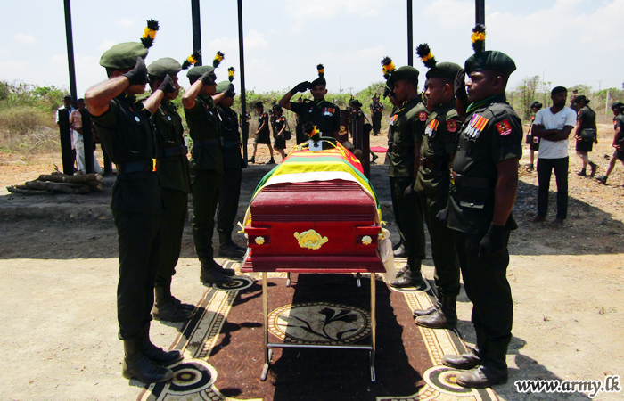 515 Brigade troops on the instructions of the 51 Division and the Security Force Headquarters - Jaffna (SFHQ-J) conducted a military funeral for retired Corporal K. Kumaraswamy of the 1 Sri Lanka Sinha Regiment (SLSR) who passed away at the Jaffna Teaching Hospital on Monday (25).