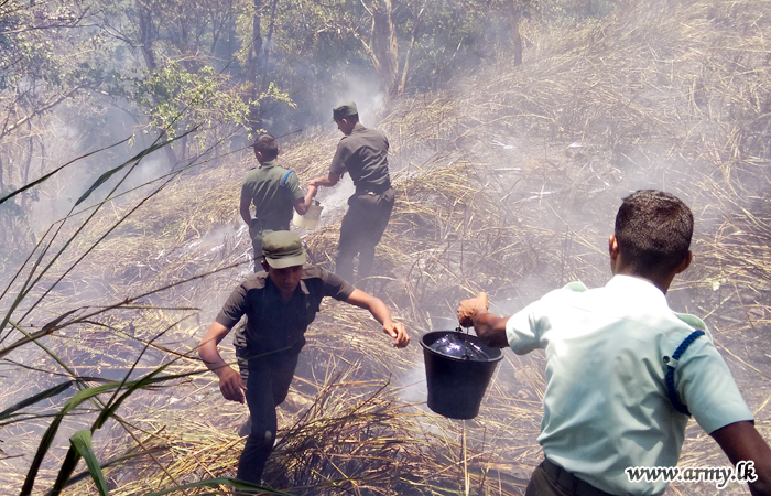 A sudden wildfire that broke out in and around the School of Signals and the Dharmaraja College hostel area in Kandy was brought to the notice of the troops of the School of Signals on Tuesday (25). The fire broke out due to prevailing drought and dry weather patterns that enveloped the area with gushing winds at times. Troops managed to douse the wildfire...