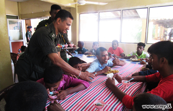 Troops of the 68 Division under the Security Force Headquarters - Mullaittivu (SFHQ-MLT) on Saturday (2) offered a special meal to 53 kids with special needs at Iniya Vazhvu Illam (Home for Happy Living) orphanage in Puthukkuddiyirippu on account of forthcoming 71st Independence Day.