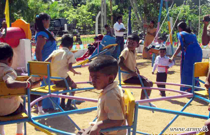 7 Gemunu Watch (GW) troops of the 683 Brigade in the 68 Division of the Security Force Headquarters - Mullaittivu (SFHQ-MLT) offered their vocational skills and renovated the kids’ park in Theravil Mathusha Pre-school premises and formally handed it over to pre-school authorities on Friday (19).