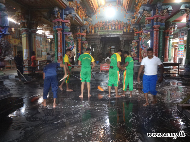 A ‘Shramadana’ campaign was conducted at Mavaddi Puram Kovil - Jaffna prior to conduct of the annual ‘Pooja’ of the temple on Monday (16). A large number of troops under command to the 515 Brigade participated in the event.