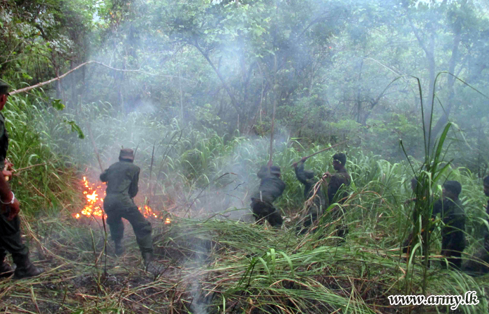 9 Sri Lanka Sinha Regiment (SLSR) troops of the 121 Brigade under the Security Force Headquarters - Central (SFHQ-Cen) on being informed of a bush fire that was spreading in Mukulara Kanda, Kumbukkana area in the Moneragala District on Saturday (14) rushed to the scene and brought it under.....