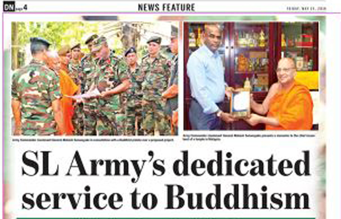 Sri Lanka's English daily, 'Daily News' newspaper in a full page feature article on Friday (25), themed 'Sri Lanka Army's dedicated service to Buddhism'.....