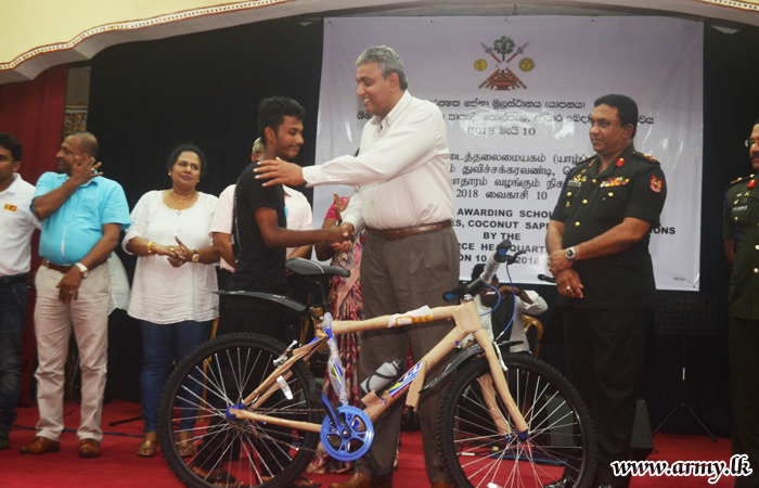 Security Force Headquarters - Jaffna (SFHQ-J), taking one more welfare initiative on behalf of the student community in the peninsula coordinated the distribution of a stock of push bicycles, scholarships and cash gifts after a close survey selected the most needy ones in consultation with teaching staff.
