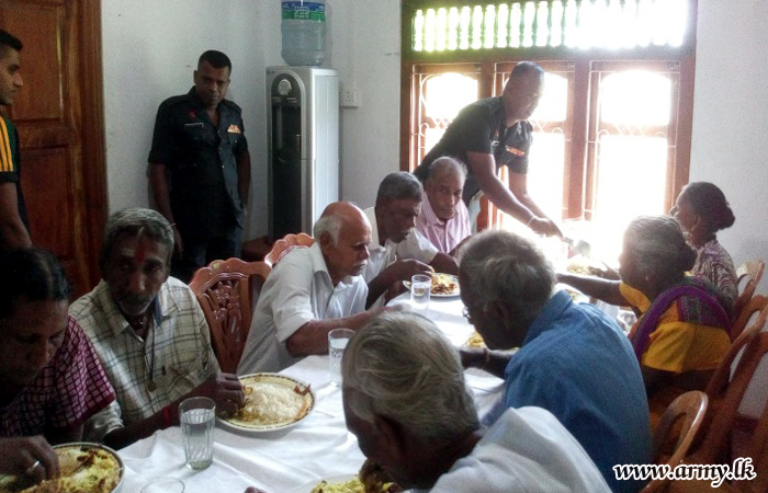 Troops of the 18 (V) Sri Lanka Sinha Regiment (SLSR) in the 513 Brigade of the 51 Division under the Security Force Headquarters - Jaffna (SFHQ-J) recently offered a lunch treat to 50 elders at the Kalvely Elders’ home in Sandilipai, Jaffna.
