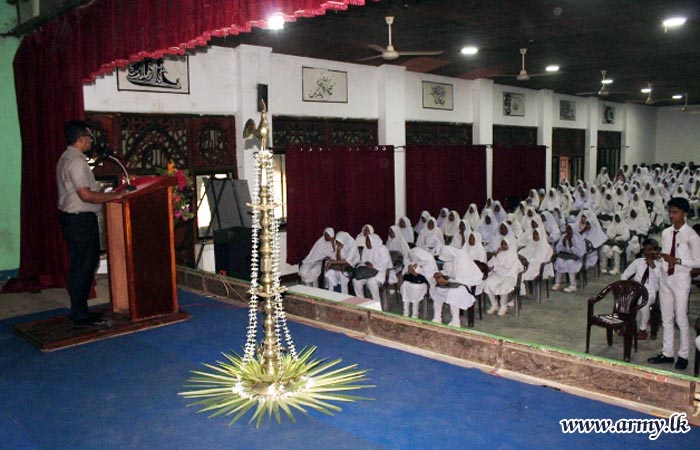 22 Division troops of the Security Force Headquarters - East (SFHQ-E) facilitated educational seminars for the benefit of students sitting the G.C.E (O/L) examination in December - 2017 at Kinniya Central College and Al–Aksha Vidyalaya, Kinniya during 25-26 November.