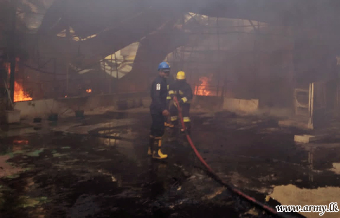 Troops of the 8 Sri Lanka Light Infantry Regiment (SLLI) and 2 Sri Lanka Army Service Corps (SLASC) under command to the Security Force HQ - West provided their fullest support to control the fire that suddenly occurred at Kandana ‘Global Care Products Company (Pvt) Ltd’ on Tuesday (8 August) morning.