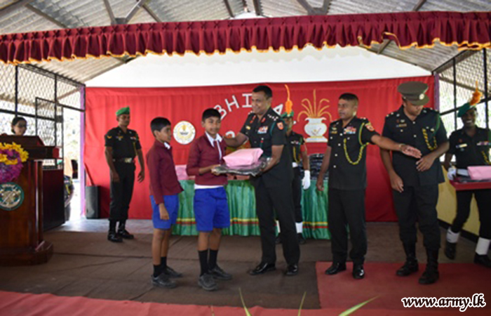 Troops of the 573 Infantry Brigade of the 57 Infantry Division under command to the Security Force HQ - Mullaittivu launched a project to donate school accessories to a group of 50 needy students learning in Bharathipuram Vidyalaya in Kilinochchi on 17 March after inviting the beneficiaries to the 9 Vijayabahu Infantry Regiment Headquarters in the area.