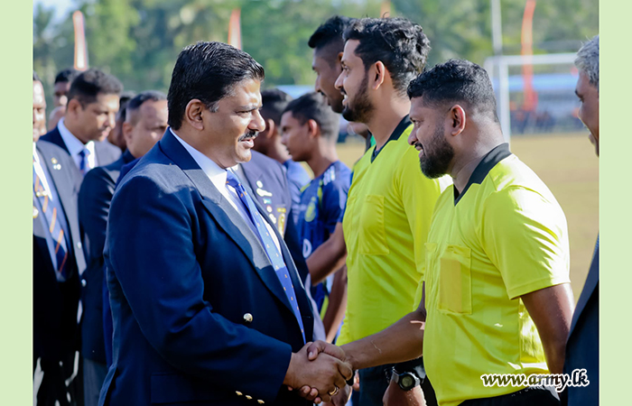 Upon his arrival, the Army Chief was warmly received by Major General Y.A.B.M. Yahampath RWP RSP ndu psc, Deputy Chief of Staff of the Army, together with Major General K.J.N.M.P.K. Nawarathna RWP RSP ndu, Director General Infantry and Chairman of the Army Football Committee, and Brigadier K.A.D.C.R. Kannangara RSP ndc, Director of Sports.