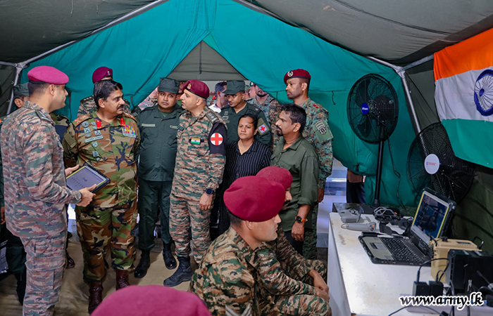 He then inspected the Indian Army Field Hospital deployed in Mahiyanganaya, where he was briefed by the Hospital Commander on ongoing medical assistance being provided to affected civilians. He also visited Yahangala to observe the landslide-stricken area and later proceeded to the Suraksha IDP Centre, where he distributed essential relief items to displaced families.