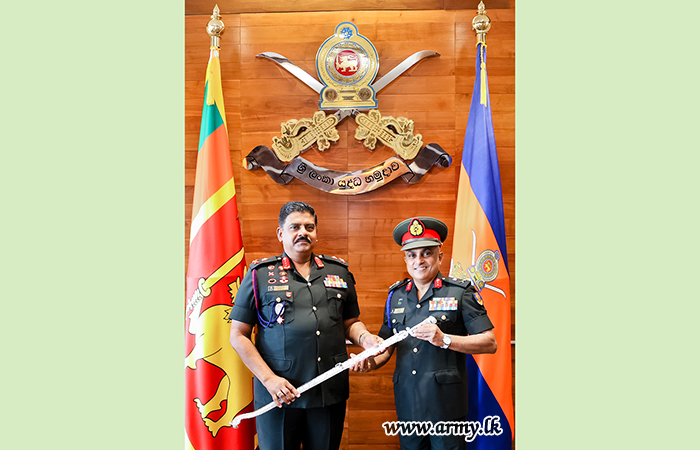 Major General A.K.D. Adikari USP ndc and Major General K.A. Pushpakumara RWP RSP USP ndc psc, received the symbols of authority and best wishes from Lieutenant General Lasantha Rodrigo RSP ctf-ndu psc IG, Commander of the Army, during a formal courtesy call held on 26 March 2026 at the Army Headquarters.