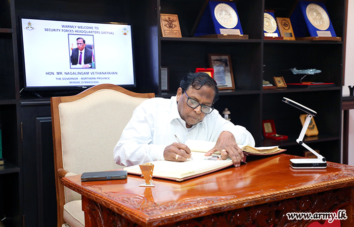 The Honorable Governor of the Northern Province, Mr. N. Vethanayahan, paid a courtesy call on Major General K.T.P. De Silva RSP ndu psc, Commander, Security Forces (Jaffna), on 23 March 2026 at the Security Forces Headquarters, Jaffna.