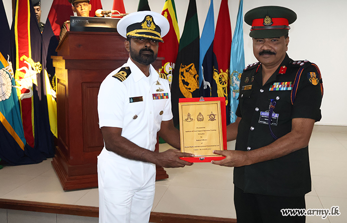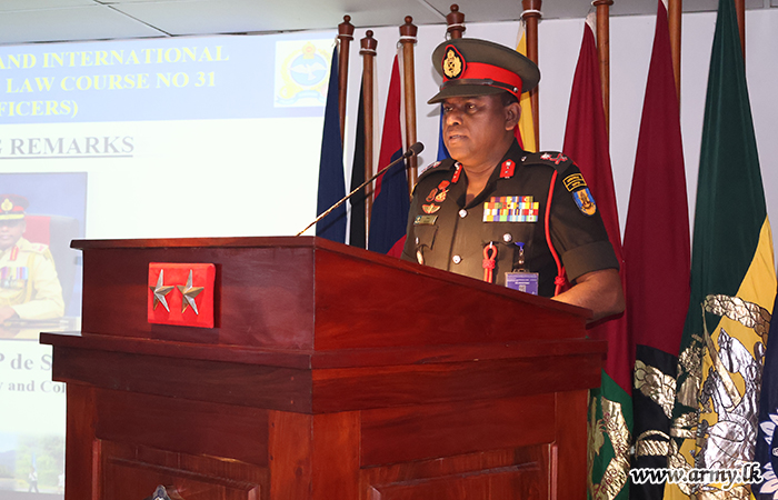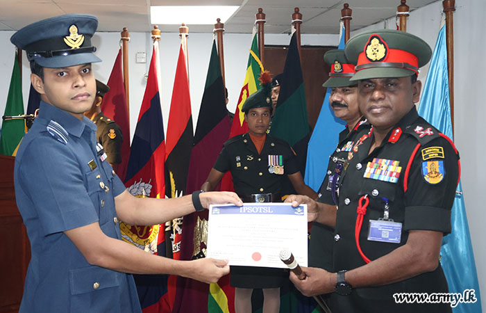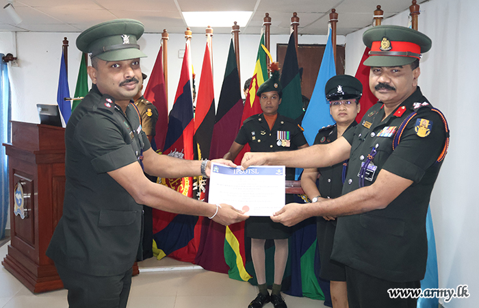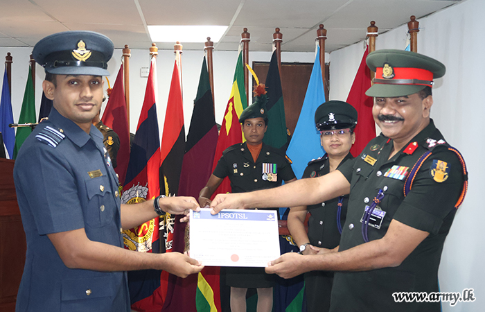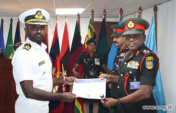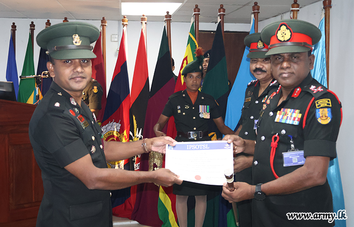 Major General K.T.P. de Silva RSP ndu psc, Adjutant General, graced the occasion as the Chief Guest and delivered the closing remarks at the certificate awarding ceremony. The Director of the Directorate of Legal Services, Human Rights and Humanitarian Law, the Commandant of IPSOTSL, senior officers, officers and other ranks were present at the event.