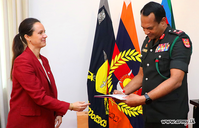 Upon arrival, she was warmly welcomed by Major General K.J.N.M.P.K. Nawarathna RWP RSP ndu, Commander, Security Forces (Jaffna). During the meeting, both parties engaged in a cordial discussion on matters of general concern.