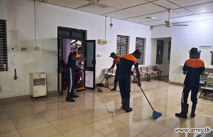 A relief team from the 16th Battalion Sri Lanka Sinha Regiment was immediately deployed to manage the situation.Working in close coordination with hospital authorities, the troops carried out immediate flood response measures, including clearing waterlogged areas, placing sandbags, cleaning affected premises and assisting hospital staff in restoring normal operations.