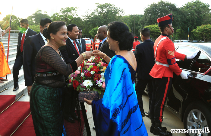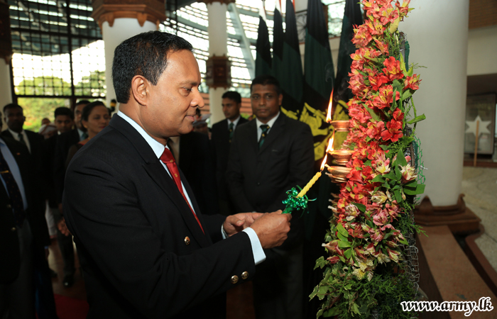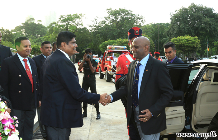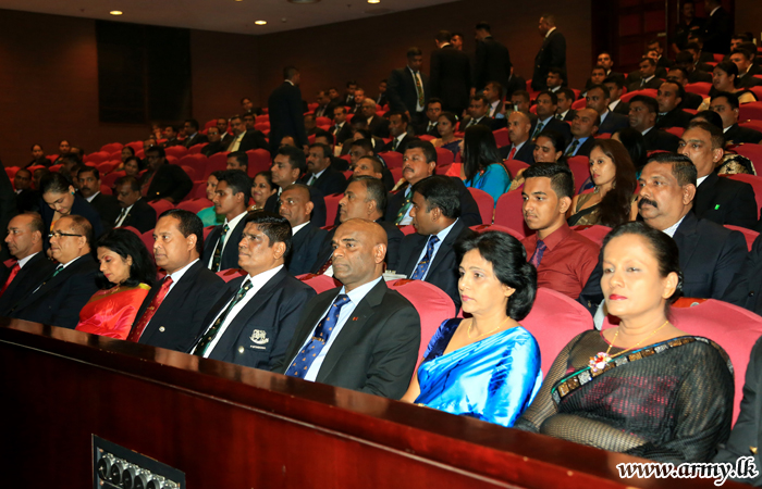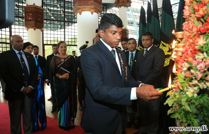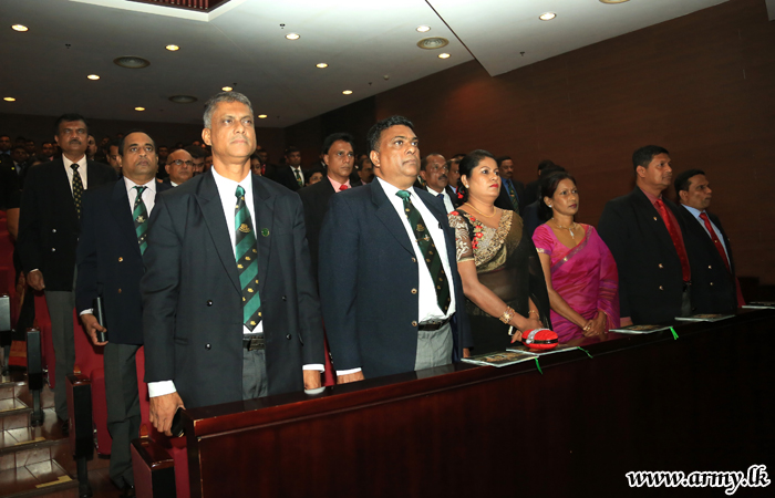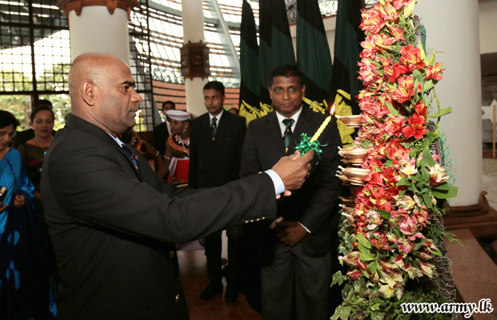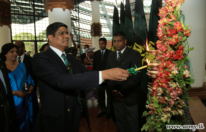 මෙම අවස්ථාවට ප්රධාන ආරාධිත අමුත්තා ලෙස සපැමිණි යුද්ධ හමුදාධිපතිතුමන්ව ශ්රවණාගාරයේ ප්රධාන දොරටුව අභියස දී ශ්රී ලංකා යුද්ධ හමුදා ස්වේච්ඡා බලසේනාවේ සේනාවිධායක තුමන් මෙන්ම ශ්රී ලංකා සිංහ රෙජිමේන්තු අධිපති මේජර් ජෙනරාල් පියල් වික්රමරත්න විසින් උණුසුම් අයුරින් පිළිගනු ලැබීය. අනතුරුව, ශ්රී ලංකා සිංහ රෙජමේන්තුවේ ජ්යෙෂ්ඨ නිලධාරින් විසින් ප්රධාන ආරාධිත අමුත්තා ශ්රවණාගාරය තුලට කැටුව යන ලදී.