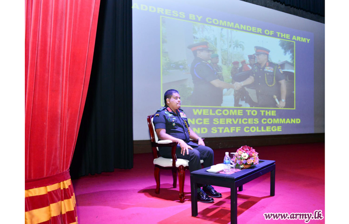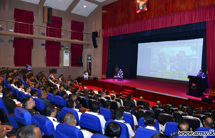 මෙම දුර්ලභ අවස්ථාවේදී, යුද්ධ හමුදාධිපති ලුතිනන් ජෙනරාල් ශවේන්ද්ර සිල්වා ආරක්ෂක සේවා අණ හා මාණ්ඩලික විද්යාලයේ පී.එස්.සී. උපාධි අපේක්ෂකයින්ට චාරිත්රානුකූල දේශනයක් සිදුකරන ලදී. ‘නැගී එන ගෝලීය තර්ජනවල ස්වභාවය සහ ජාතික ආරක්ෂාවට බලපෑම්’ යන මාතෘකාව යටතේ යුද්ධ හමුදාධිපතිතුමන් සිදුකළ මෙම දේශනයට උපාධි අපේක්ෂකයින් 158 දෙනෙකු සහභාගි වූහ.