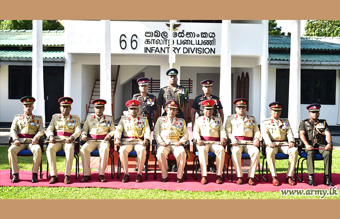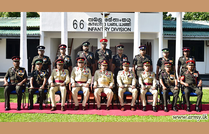 අභිනවයෙන් උසස්වීම් ලබා යුද්ධ හමුදාධිපතිතුමන්ගේ සුරතින් නිල ලාංඡන පළඳවා පුනරීන් හි පිහිටි 66 වන සේනාංක මූලස්ථානය වෙත සපැමිණි එම සේනාංකයේ සේනාංකාධිපති මේජර් ජෙනරල් නලින් ජයවර්ධන වෙත පසුගිය බදාදා (8) දින එම සේනාංකයේ භටපිරිස් විසින් හමුදා සම්ප්රදායානුකූල ගෞරවාචාරය පුදකරන ලදී.
