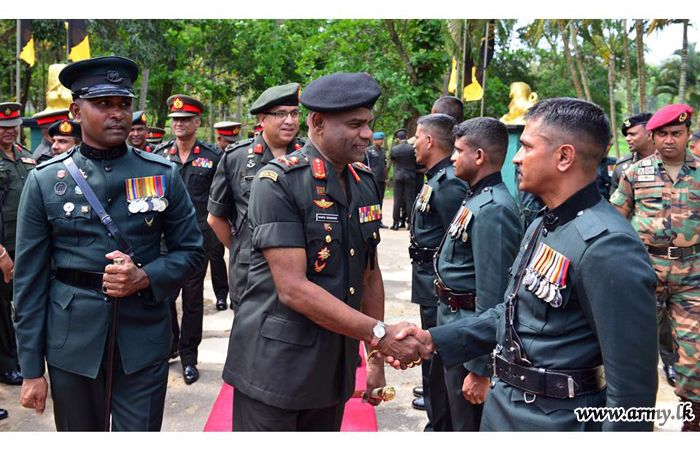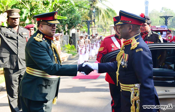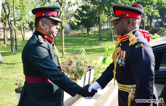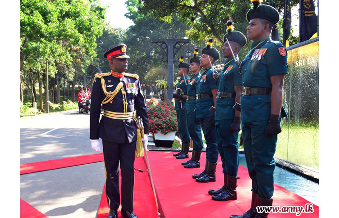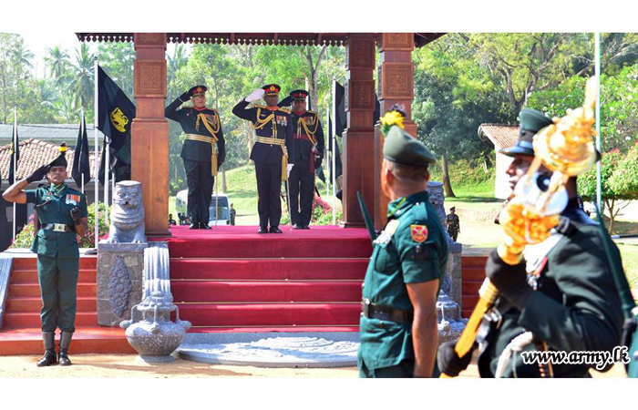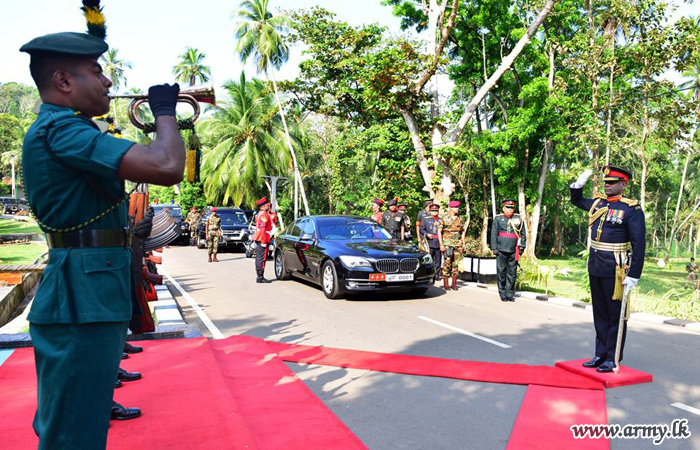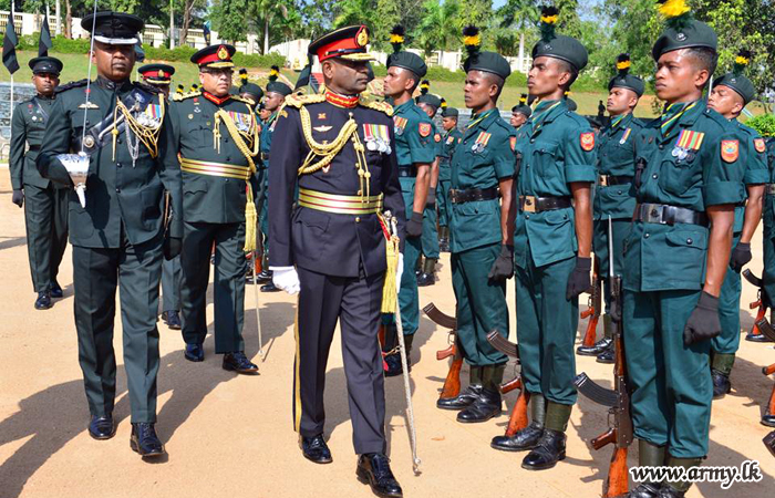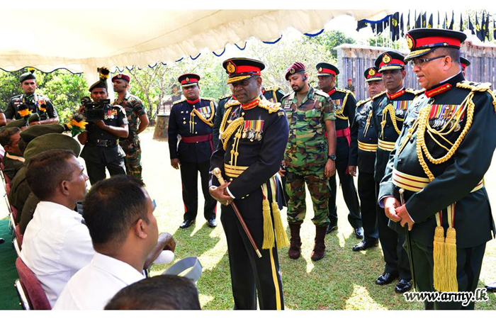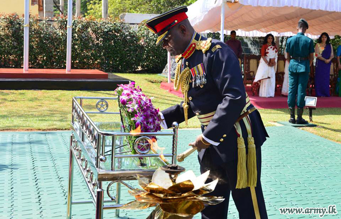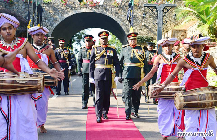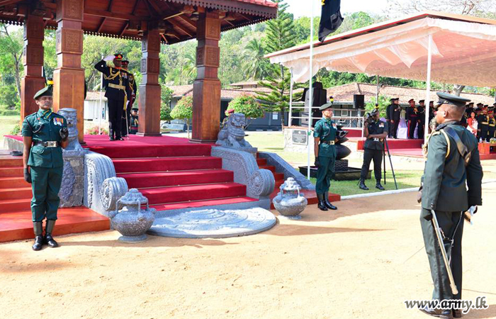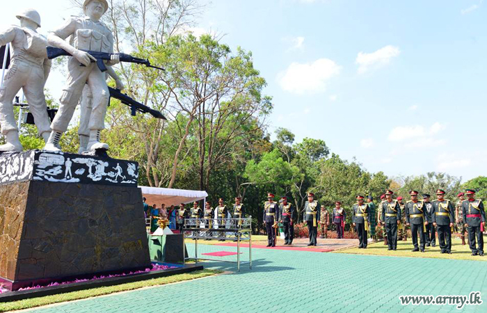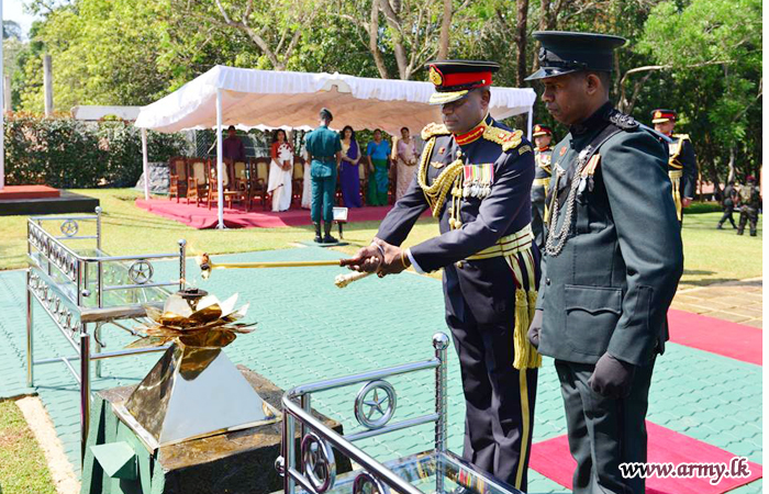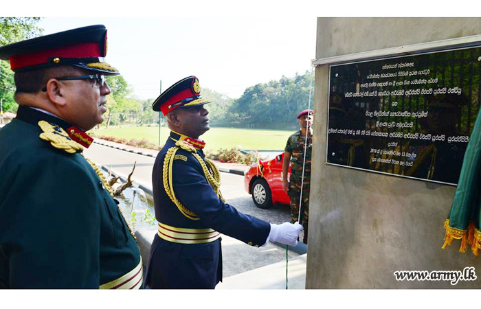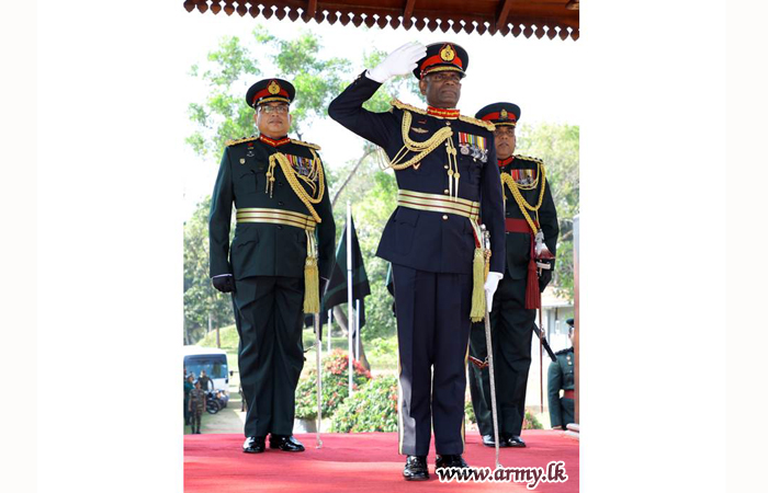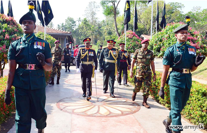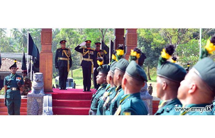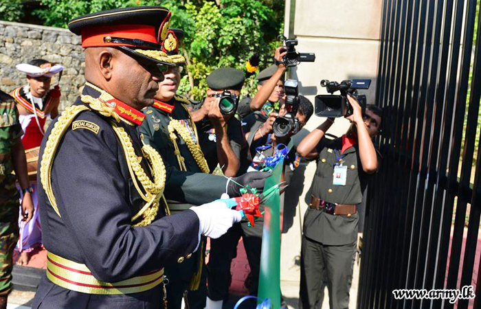 එහි සපැමිණී යුද්ධ හමුදාධිපතිතුමන් ශ්රී ලංකා සිංහ රෙජිමේන්තුවේ භට පිරිස් විසින් කදවුරු සම්මාන මුරයක් පිරිනැමු අතර රෙජිමේන්තු අධිපති මේජර් ජෙනරාල් කුමුදු පෙරේරා විසින් එතුමන් උණුසුම් අයුරින් පිළිගනු ලැබිය. අනතුරුව දීර්ඝ කාලීන අවශ්යතාවයක්ව පැවති නවතමයෙන් ඉදිකරන ලද රෙජිමේන්තු මූලස්ථානයට පිවිසේන ප්රධාන දොරටුව විවෘත කිරිම සඳහා සමරුඵලකය නිරාවණය කිරිම යුද්ධ හමුදාධිපතිතුමන් විසින් සිදු කෙරිණි.