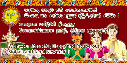 යුද්ධ හමුදාධිපති ලුතිනන් ජෙනරාල් ක්රිෂාන්ත ද සිල්වා, සියලු ජ්යෙෂ්ඨ නිලධාරින්, නිලධාරින්, සෙසුනිලයින් සහ සිවිල් කාර්යමණ්ඩල සාමාජිකයින් ඇතුළු සියලු දෙනාහට ලැබුවාවූ සිංහල හා දමිළ අලුත් අවුරුද්ද සාමයෙන් හා සමෘද්ධියෙන් පිරි සුබ අලුත් අවුරුද්දක් වේවායි ප්රාර්ථනා කරනු ලබයි !